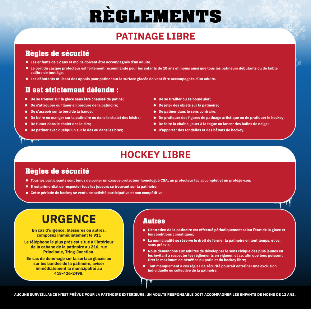 Combien de jours la patinoire a-t-elle été ouverte cette année? Quel critère a le plus d’impact sur la fermeture ou l’ouverture de la patinoire? Est-ce que les autres municipalités ont les mêmes équipements que nous? Voici des exemples de questions auxquelles la lecture de ce rapport vous permettra de répondre!